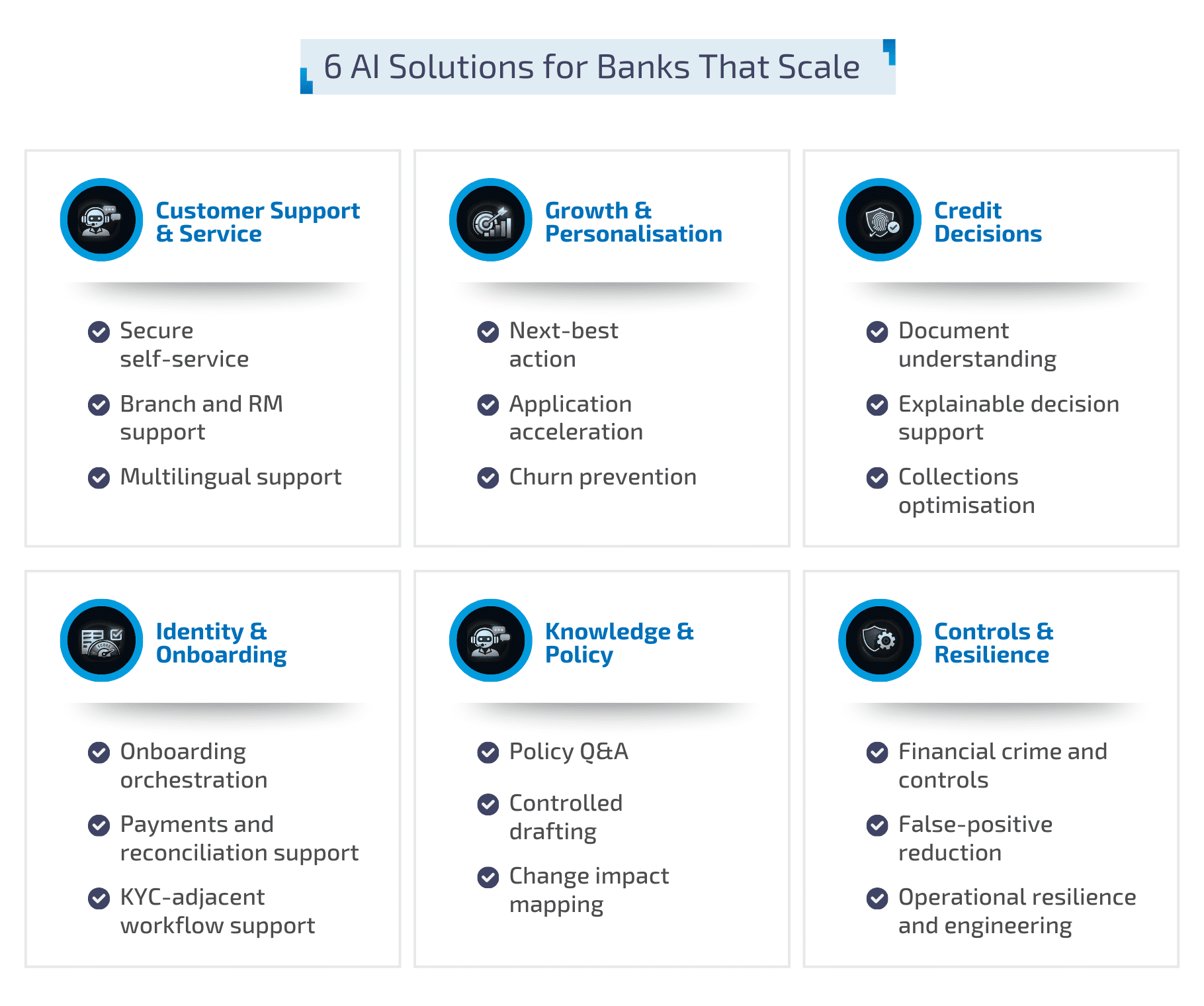 In banking, “AI solutions” are not a single category. They typically fall into distinct solution families, based on where they sit in the customer journey, how decisions are made, and how much control and auditability is required. The strongest programmes treat these as repeatable building blocks that can be rolled out across products, teams, and countries, rather than one-off pilots.
