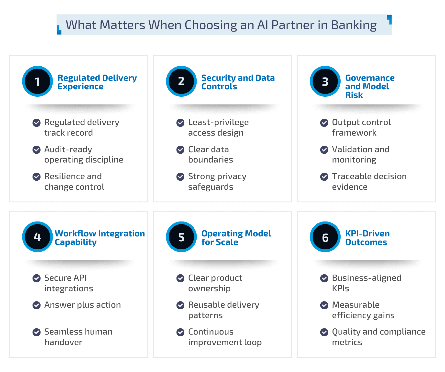 In banking, the difference between an AI pilot and a scalable capability usually comes down to partner fit. You need a partner who can work within strict security and regulatory constraints, integrate into real workflows, and still deliver measurable outcomes at pace. Use the six criteria below as a practical checklist to separate impressive demos from production-ready delivery.