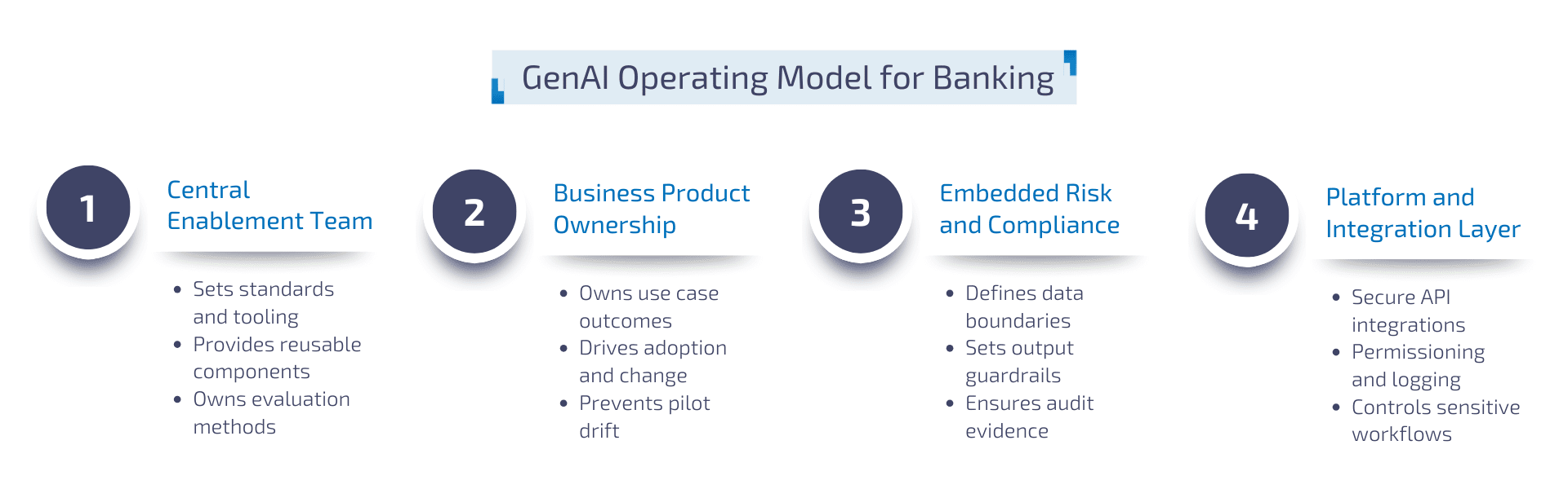 Most banks that scale GenAI successfully converge on an operating model that balances speed with control. The exact org design varies, but the core components are consistent.