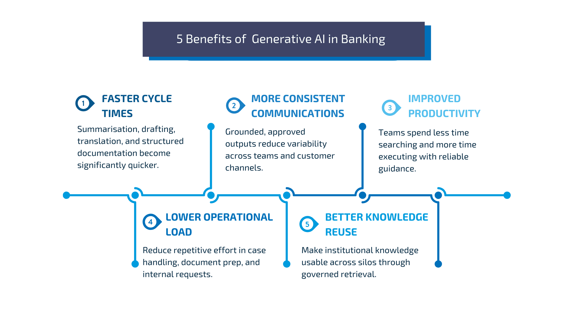 When deployed with strong governance and secure integration, generative AI improves speed, consistency, and productivity across banking operations while keeping risk and compliance under control.
