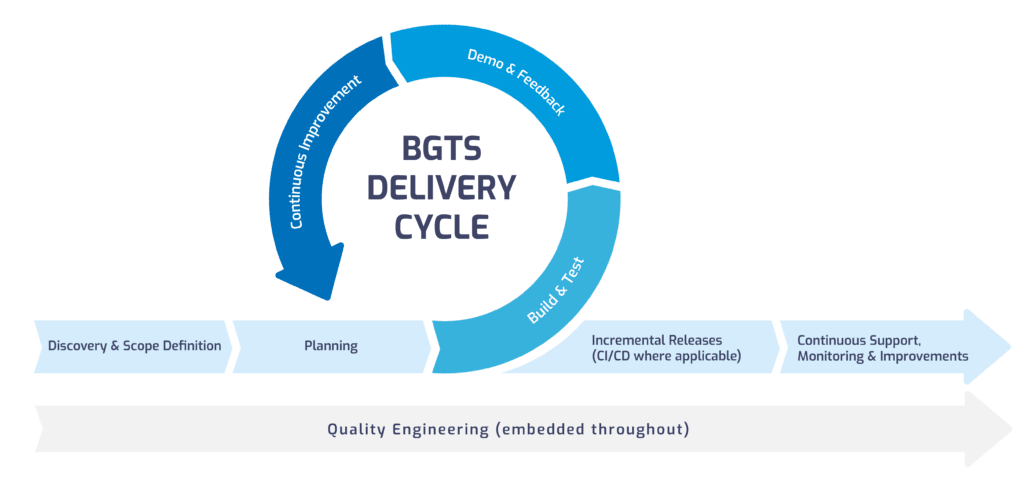 BGTS takes end-to-end ownership of the SDLC, combining proven delivery governance with the right engagement model for your needs. Whether you require flexibility, controlled scope evolution, or fixed-scope delivery, we ensure visibility, quality, and reliable outcomes so you can focus on your core business.